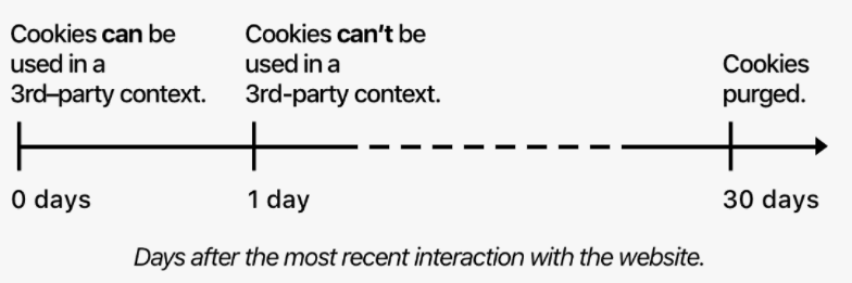ITP tracks which cookies are more desired by users (those that are first-party including logins for social media) and those that are third-party and have been placed by advertizers. As per the above diagram, those that are third-party cookies are blocked after one day and then completely purged from the user's device after one month.