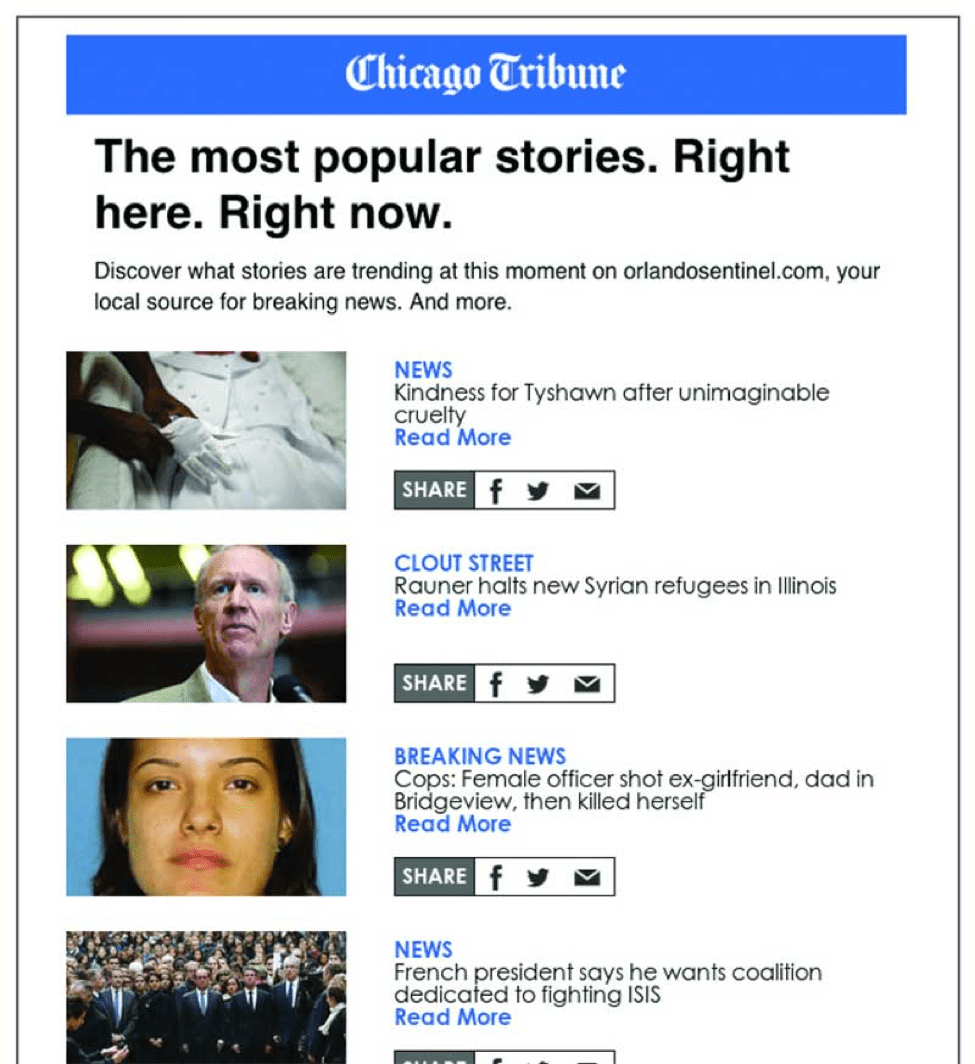 - A news or social media feed. The Chicago Tribune waded into the interactive email waters with an email that featured a live feed of their latest news stories. Readers were able to scroll through the latest stories and click through directly to read it.