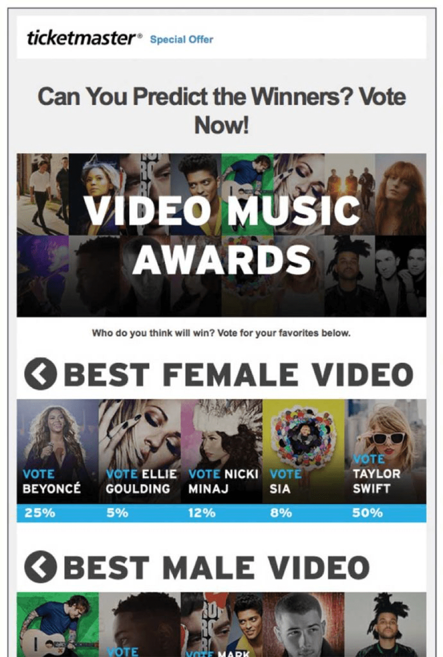 - A survey that can be taken entirely within the email. Ticketmaster used interactive email to send out a poll just before the MTV Music Video Awards asking subscribers who would win in different categories. After voting directly from the email, they were redirected to an online voting page where they could see the results of voting up to that point. They saw a 182% increase in opens and 80% of people voted again after seeing the results page.