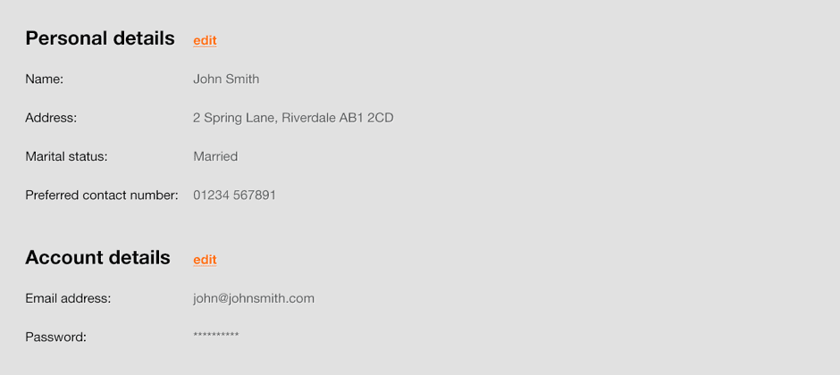 Similarly, as logged-in users will likely have already provided you with a certain amount of information, they shouldn’t be expected to have to answer the same questions as new users. In these cases, form length can be minimised by displaying details as static text with the option to edit if needed, and fields unlikely to need updating (such as “Date of birth”) can even be removed entirely, as in the following example.