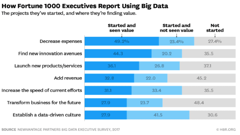 After all, not all data is created equal and the need for massive numbers varies from company to company. According to a 2017 big data survey conducted by NewVantage, the top reasons for big data initiatives include decreasing expenses, exploring innovation opportunities and launching new products and services: