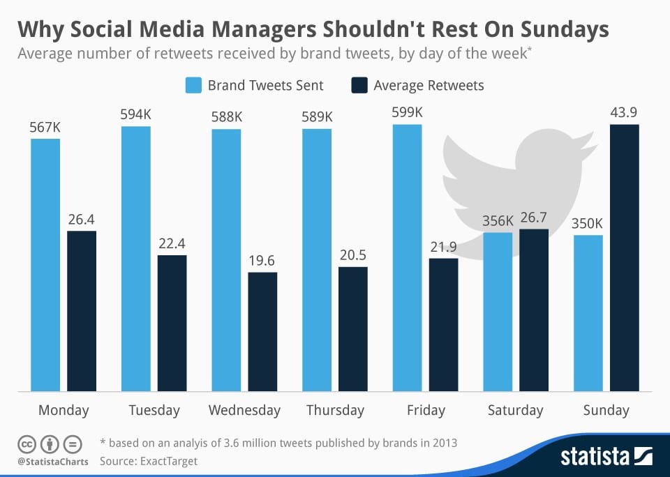 You shouldn’t neglect a single day of the week either. Stats from Statista Charts show that brands send out the least number of tweets on Sunday even though the day is a particularly strong one for social media engagement:
