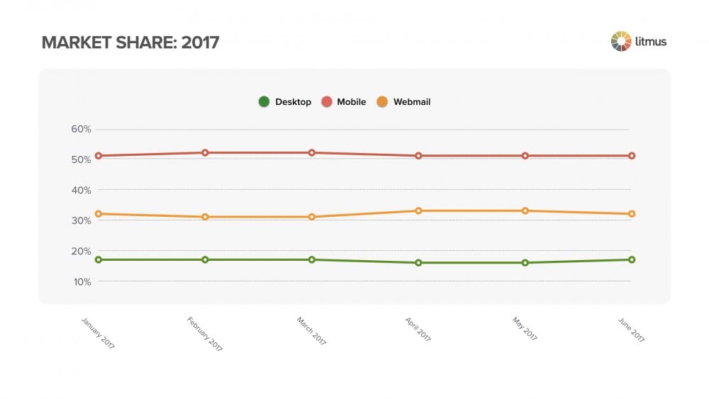 A recent report by Litmus shows what 2017 has taught us about the use of email clients in the past year. Whilst there is a rise in webmail, mainly driven by Gmail, mobile has consistently had the highest market share (50% an over).