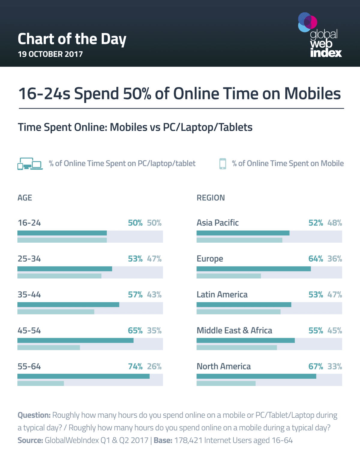 For instance, in a recent research study published by Global Web Index, mobile and desktop both engage 16-24-year-olds with the same amount of time spent online. However, as the age of users increases the time spent on mobile decreases. But, don't forget, as time progresses more and more people will adopt a mobile-first approach, and soon it will be a huge competitor for desktop consumed content as millennials start aging through different age boundaries.