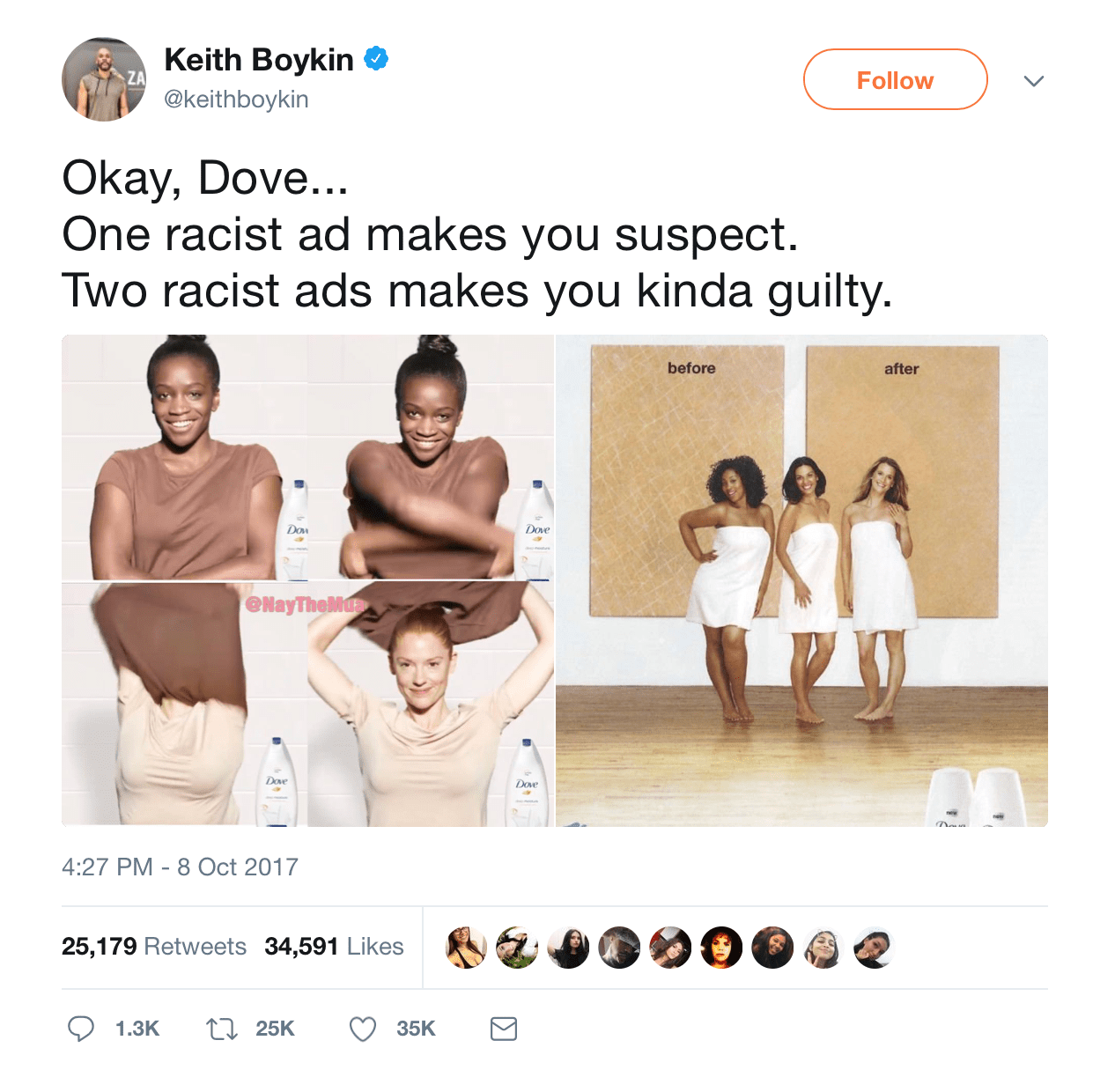 Social media erupted over a looped three-second clip for Dove body wash which showed a black lady removing her top to reveal a white lady, who then removed her own top to reveal an Asian lady (perhaps suggesting Asians are more preferable than Caucasians). However, the latter part of the clip was dismissed and edited away by commentators - leaving the impression that the brand was vehemently pro-white and anti-black.