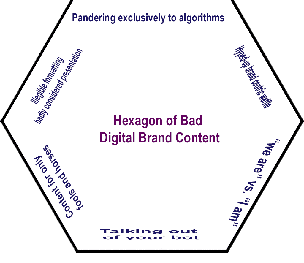 Quantity rather brand quality dominated. The result was what I call the Hexagon of Bad Digital Brand Content: