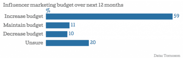 In a 2015 study conducted by Tomoson, 59% of marketers expressed their intention to increase their spending on influencer marketing. 10% said that they would be reducing their influencer marketing budget, while 11% would be maintaining the same budget.