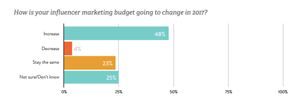 The same study found that influencer marketing budgets would be increasing further in 2017. 37% said that they would be allocating $50,000 to $100,000 for influencer marketing, 21% said that they would spend $25,000 to $50,000. Only 7% said that they would be spending less than $10,000 on influencers.