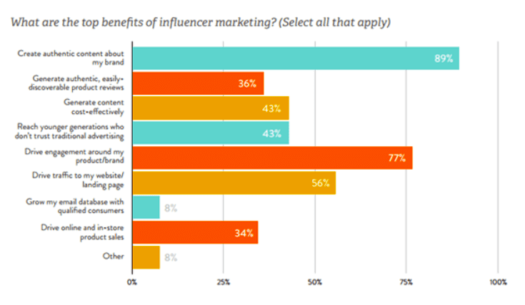 This remained consistent even in 2016 with the Linqia study reporting that 89% of marketers were using influencer marketing to create authentic content about their brand. The second most important benefit was to drive engagement with their product or brand.