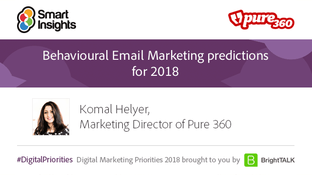Join Komal Helyer, Marketing Director of Pure360, one of eight speakers, for a practical webinar on Behavioural Email Marketing predictions for 2018. Learn the strategies brands will execute to recover lost revenue and increase sales uplift online, using behavioral email marketing.
