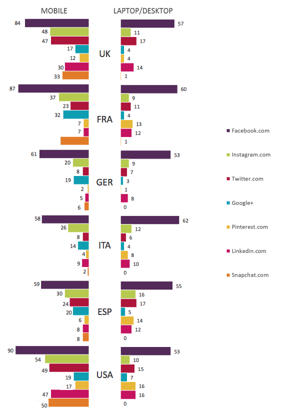 As shown, Facebook is the widest-reaching social media network among all countries compared - its reach is far higher than any other social media network on desktop and mobile.